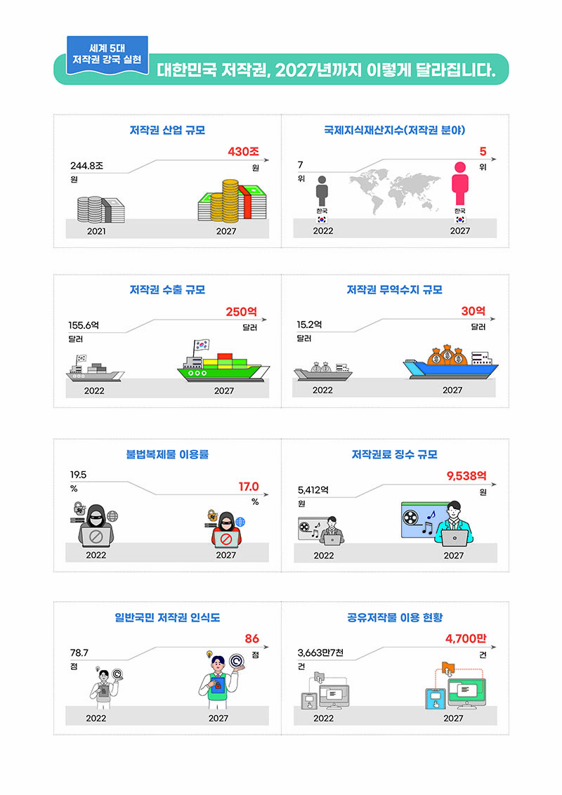 이를 통해 저작권 수출 규모는 지난해 155억 달러에서 2027년 250억 달러로 연평균 10% 늘리고, 불법복제물 이용률은 지난해 19.5%에서 17.0%로 연평균 0.5% 줄인다는 계획이다. 국제지식재산지수 저작권 분야에서는 지난해 7위에서 5위를 목표로 한다.