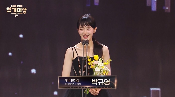 배우 박규영이 '2023 MBC 연기대상' 미니시리즈 부문 여자 우수연기상의 영예를 안았다.