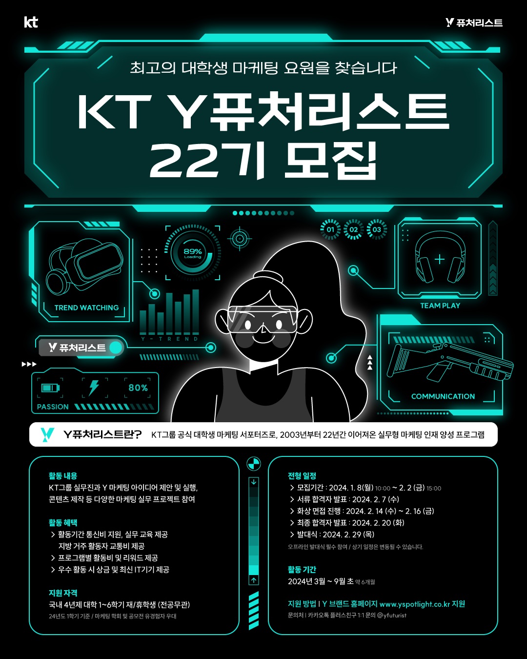 KT가 2024년도에 활동할 KT의 대학생 마케팅 서포터즈 그룹인 ‘Y퓨처리스트’를 1월 8일부터 2월 2일까지 모집한다고 밝혔다.