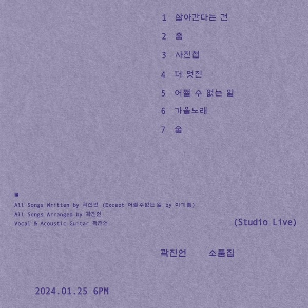 한편, 곽진언의 새 미니앨범 ‘소품집(Studio Live)’은 오는 25일 오후 6시 각종 음원사이트를 통해 발매된다.