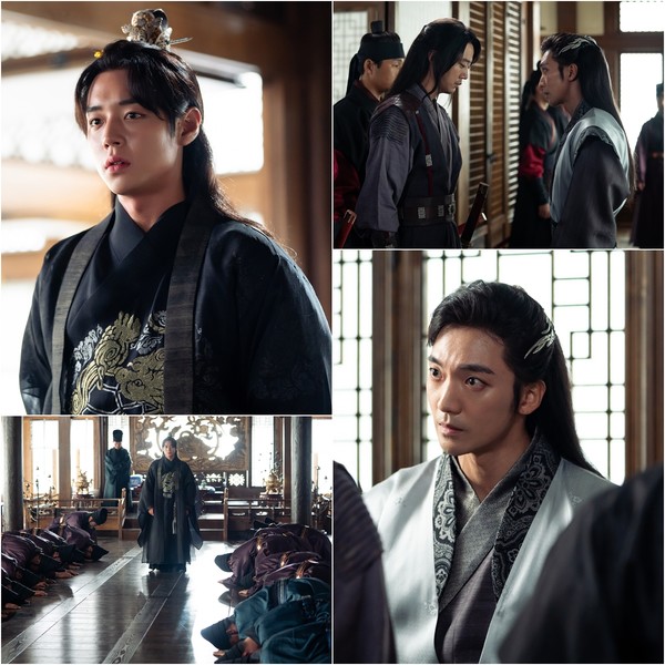 특히 편전 입구에서 왕의 호위무사 지전서(한은성 분)에게 가로막힌 사조 융의 모습이 눈길을 끈다. 그는 자신의 앞을 막아선 이들을 살기 어린 눈빛으로 바라보지만, 지전서 역시 흔들림 없이 왕의 명령을 수행하고 있어 긴장감을 더한다.