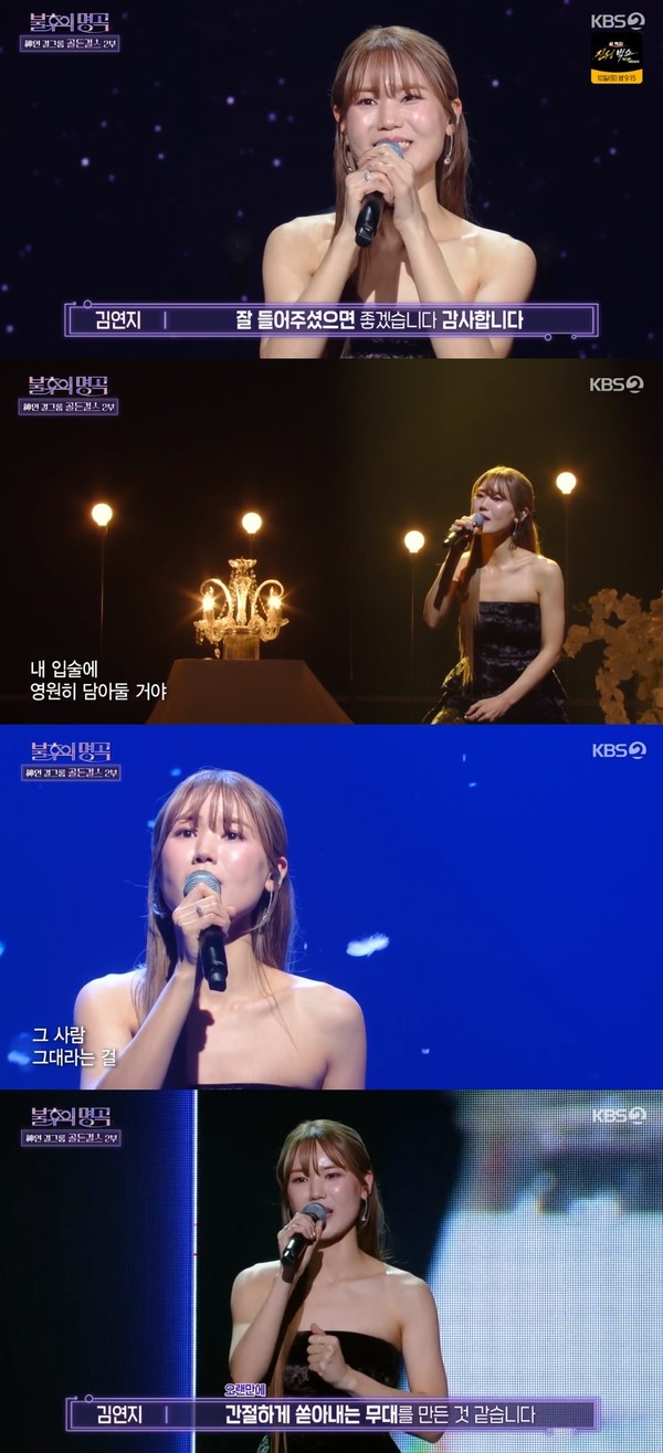 가수 김연지가 '불후의 명곡'에서 호소력 짙은 목소리로 애절한 무대를 완성했다.