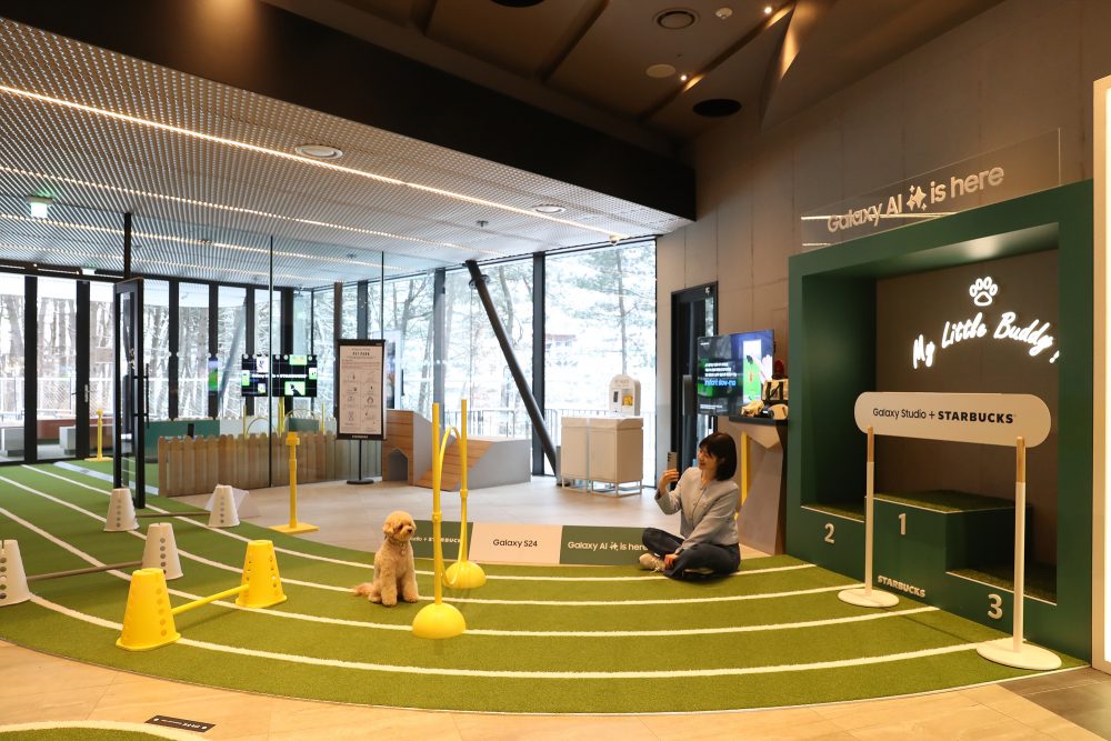 국내 최초 펫 프렌들리 스타벅스 매장인 ‘스타벅스 더북한강R점’에 마련된 ‘갤럭시 스튜디오 Pet’은 펫 맞춤형 놀이공간과 포토 스팟에서 ‘갤럭시 S24 시리즈’의 강력한 AI와 카메라 기능을 체험할 수 있도록 꾸며졌다.