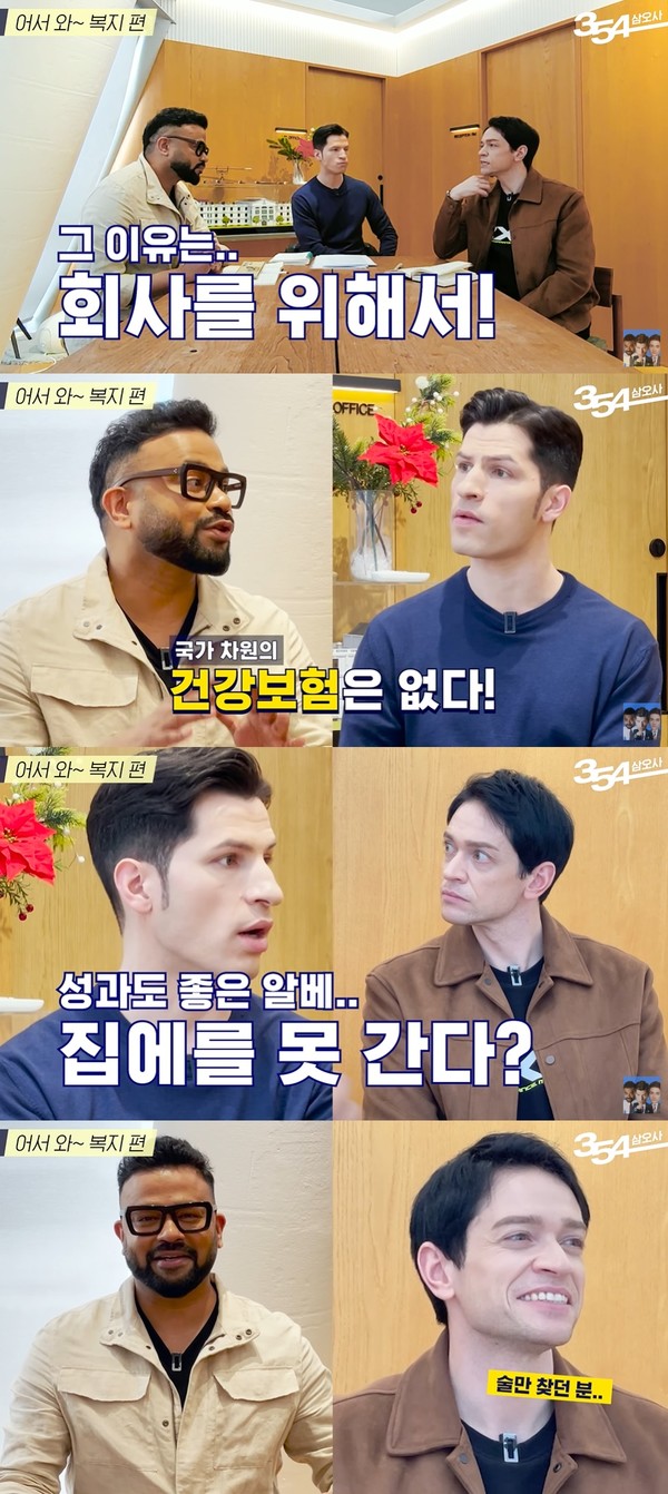 '354 삼오사' 멤버 중 유일하게 한국에서 직장인으로 일한 경력이 있는 알베르토는 '출퇴근 유연성'을 꼽으며 "출근도 일찍 했고, 자신의 업무가 모두 끝났는데도 상사의 눈치를 보느라 다들 퇴근을 못했다"고 자신의 경험담을 털어놔 공감을 불러일으켰다.