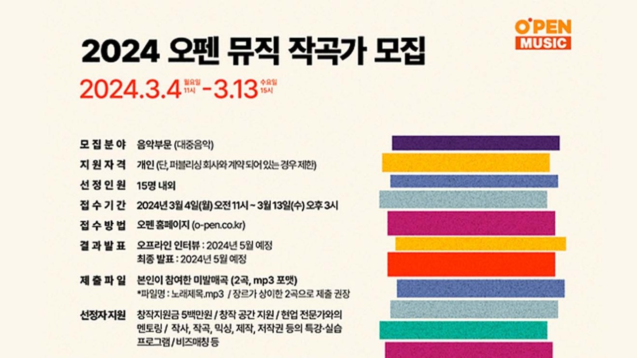 오펜 뮤직 공모전은 3월 4일(월)부터 13일(수)까지 오펜 홈페이지(o-pen.co.kr)를 통해 접수할 수 있다. 본인이 참여한 미발매곡 2곡을 제출해야 하며, 퍼블리싱 회사와 계약되어 있는 경우는 지원이 제한된다. 최종 합격자는 현업 작곡가를 포함한 업계 전문가 심사를 거쳐 5월 중 발표된다. 상세 모집 요강 및 유의사항은 오펜 홈페이지에서 확인할 수 있다.
