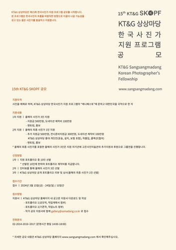 KT&G 상상마당이 한국사진가 지원 프로그램 '제15회 KT&G SKOPF(Sangsangmadang Korean Photographer's Fellowship)'의 참가자를 오는 24일까지 모집한다.