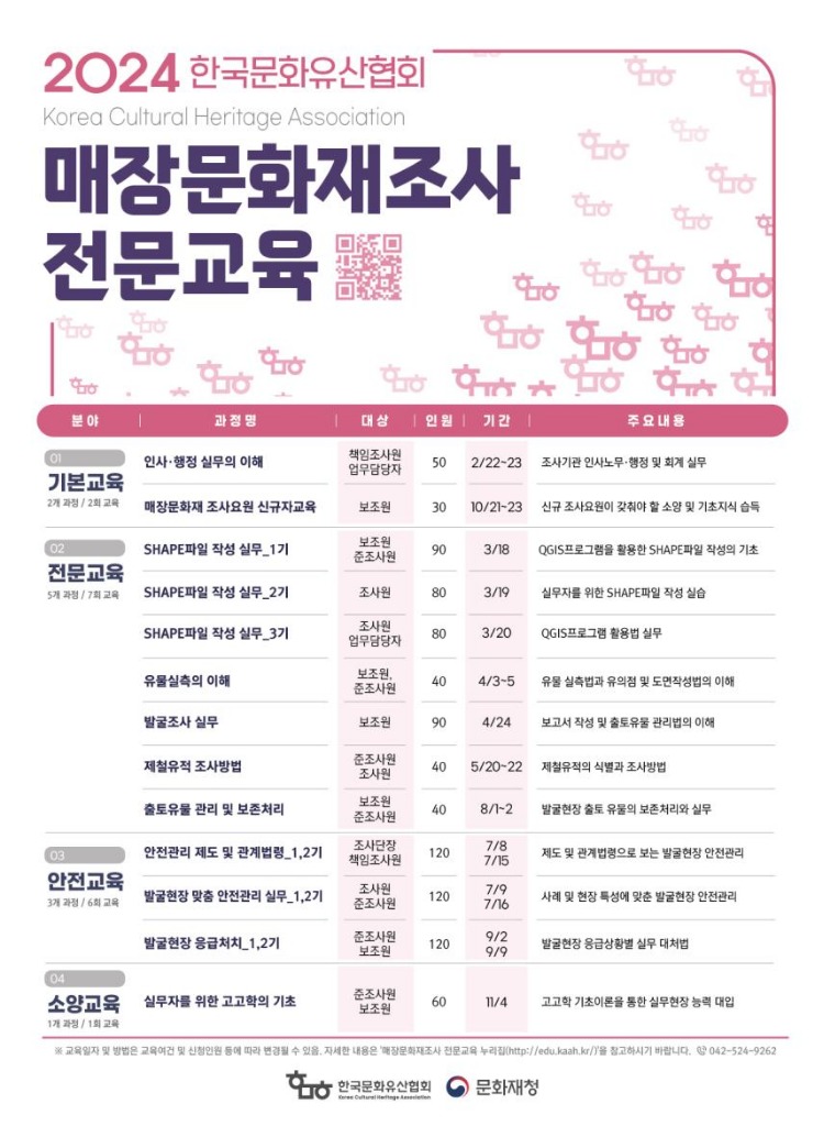 문화재청은 (사)한국문화유산협회와 함께 11월까지 매장유산 조사인력의 역량·전문성 및 안전의식 향상을 위하여 「2024년도 매장유산조사 분야 전문교육」을 시행한다. 교육 대상은 발굴조사기관, 박물관, 연구소 등에 재직하는 매장유산 조사인력을 비롯하여 관련학과 대학(원)생, 지자체·공공기관의 업무담당자 등이다.