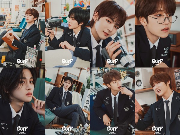 책을 펼치고 있는 진수, 캠코더를 들여다보고 있는 카엘과 타쿠마, 안경을 쓴 준우의 모습도 호기심을 유발한다. 도현은 시크한 눈빛을 발산했고, 이안은 자신감 넘치는 포스를 내뿜었다. LP판을 들고 있는 지은호와 은섭의 밝은 미소도 ‘BUFF’에 담길 긍정적인 메시지를 기대하게 만든다.