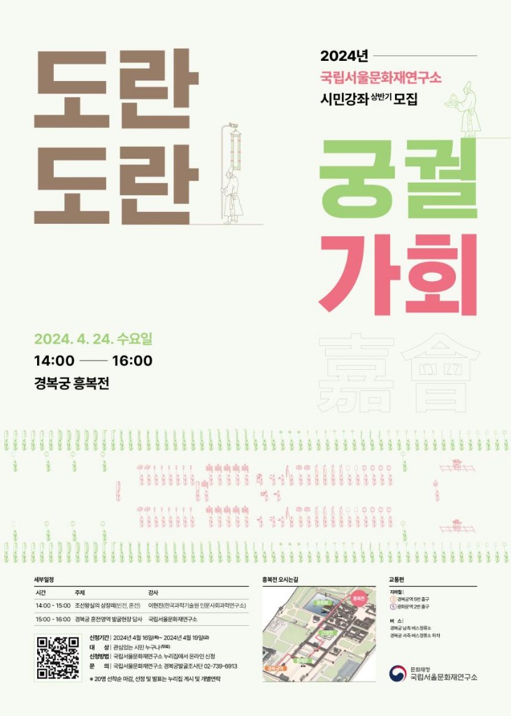 문화재청 국립문화재연구원 국립서울문화재연구소(이하 ‘서울연구소’)는 조선시대 왕실의 상장례를 주제로 한 전문가의 강의를 듣고, 경복궁 내 발굴조사 현장을 답사해보는 시민강좌 「도란도란 궁궐 가회(嘉會)」를 오는 4월 24일과 9월 25일 오후 2시부터 4시까지 경복궁 흥복전(서울 종로구)에서 개최한다.
