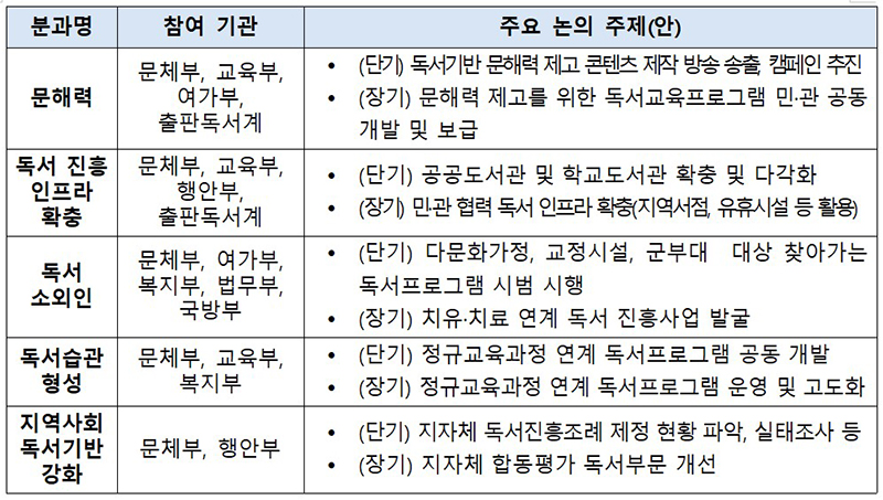 도서 구독 서비스 비용의 문화비 소득공제 항목 포함 연구, 독서 정책 성과관리체계 개선, 국민독서 실태조사의 조사방법론 개편, 독서문화진흥법 개정 소요 발굴 등 독서 분야 정책체계도 고도화한다.