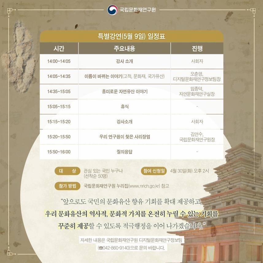 문화재청 국립문화재연구원(이하 ‘연구원’)은 오는 5월 9일 오후 2시 국립문화재연구원 분석과학관 강당(대전 유성구)에서 국가유산체제 전환에 맞춰 일상생활 속에서 쉽게 접할 수 있는 다양한 국가유산들을 연구원의 전문가 해설로 쉽게 풀어보는 「국가유산 속 숨은 이야기」 특별 강연을 개최한다.