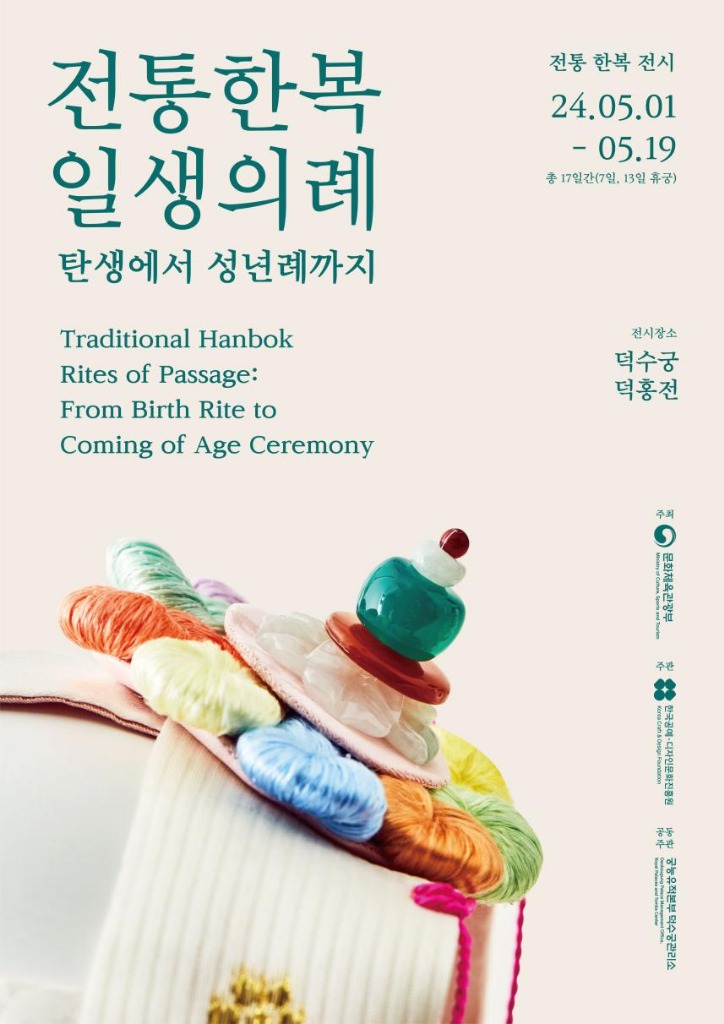 문화재청 궁능유적본부 덕수궁관리소는 5월 1일부터 19일까지 덕수궁 덕홍전(서울 중구)에서 한국공예·디자인문화진흥원과 5월 가정의 달을 맞아 탄생부터 성년례까지 성장기별 주요 의례에 착용하는 한복을 선보이는 <전통한복 일생의례, 탄생에서 성년례까지> 전시를 개최한다.