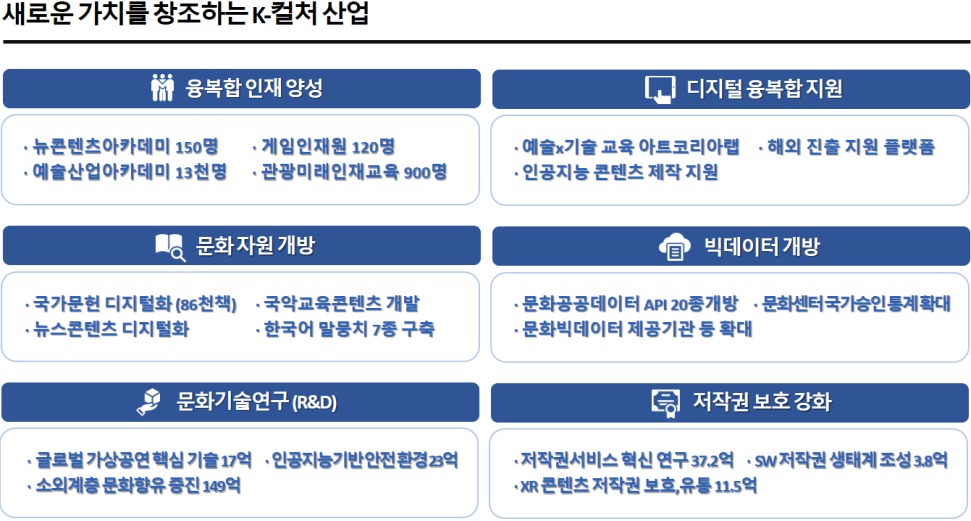 문체부는 먼저, 케이-컬처 산업이 디지털과 결합해 새로운 가치를 창조하고, 경쟁력을 확보할 수 있도록 문화와 기술 분야 융·복합 창의인재와 기업을 육성하고, 민간분야 창작 생태계를 지원하기 위한 문화자원의 개방을 확대한다.
