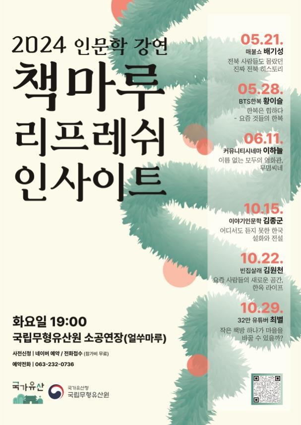 문화재청 국립무형유산원은 5월 21일(화), 5월 28일(화), 6월 11일(화) 오후 7시에 총 3회에 걸쳐 국립무형유산원 소공연장(전북 전주시)에서 <2024 상반기 ‘책마루’ 문화프로그램 인문학 강연>을 개최한다.