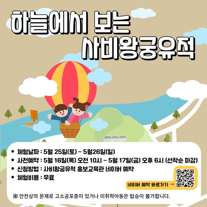 참가자들은 사비왕궁유적에 대한 유적 설명을 들은 뒤, 열기구에 탑승하여 하늘에서 세계유산이자 부여의 대표적인 국가유산인 부소산성과 관북리유적을 백마강의 아름다운 경관과 함께 직접 내려다보는 이색적인 체험을 할 수 있다.