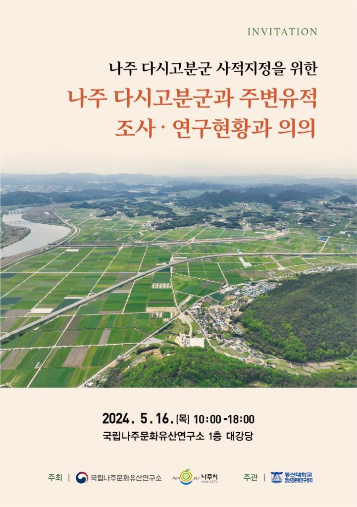 문화재청 국립문화재연구원 국립나주문화재연구소는 나주시, 동신대학교 영산강문화연구센터와 함께 오는 16일 국립나주문화재연구소 1층 대강당(전남 나주시)에서 「나주 다시고분군과 주변유적 조사·연구 현황과 의의」 국제학술대회를 개최한다.