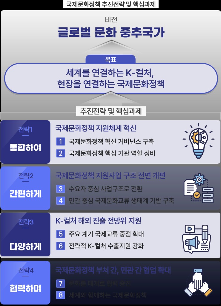 그동안 문화예술, 콘텐츠, 관광, 체육 등 국제문화교류에 참여한 유관기관과 개인, 단체, 기업들이 함께한 간담회에서 나온 주요 정책 개선사항을 종합해 기존 국제문화 정책을 개편하고, 케이-컬처의 세계 진출 지원을 강화할 4가지 전략과 8가지 핵심과제를 마련했다.