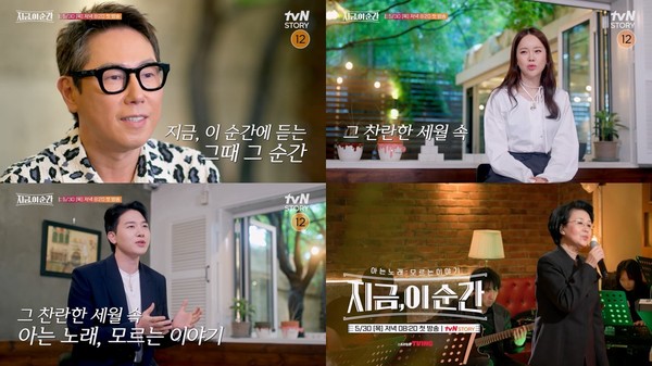 오는 5월 30일(목) 저녁 8시 20분 tvN STORY에서 첫 방송되는 신규 음악 예능 ‘지금, 이 순간’이 1화 메인 예고편과 함께 제작진의 기획 의도와 3MC의 레전드 추천곡을 공개했다.