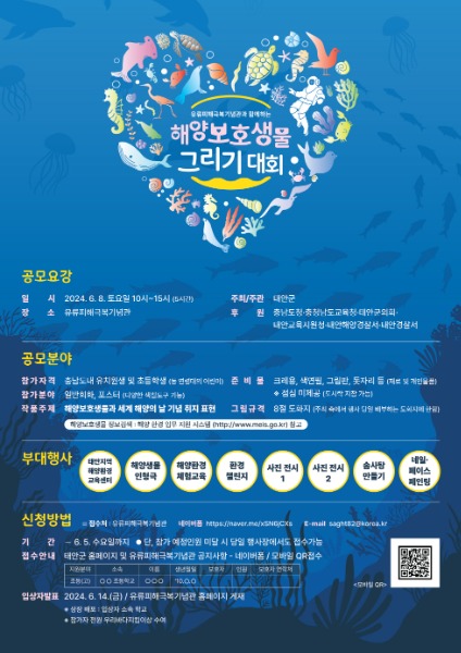 군은 6월 8일(토) 오전 10시 만리포 해수욕장 인근 유류피해극복기념관 잔디광장에서 도내 유치원생 및 초등학생을 대상으로 ‘해양보호생물 그리기 대회’를 개최키로 하고 6월 5일까지 참가 신청을 받는다고 밝혔다.