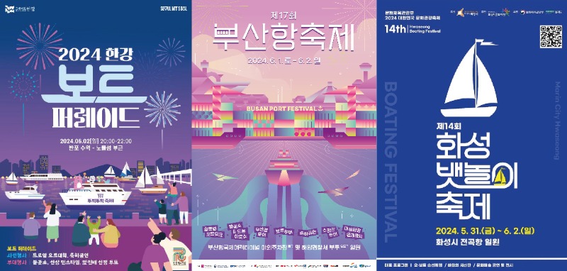 ▲ (좌)한강보트퍼레이드 포스터 /(중)부산항축제 포스터 / (우) 화성뱃놀이축제 포스터