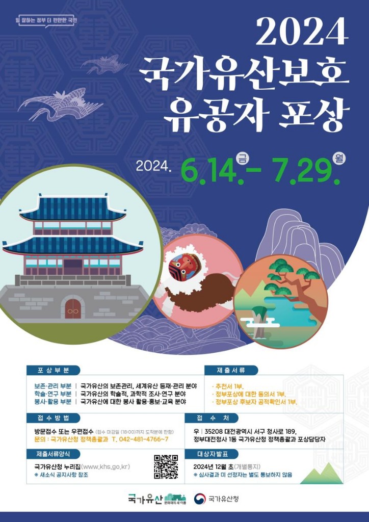 국가유산청은 6월 14일부터 7월 29일까지 국가유산의 보존·연구·활용 분야에서 뛰어난 공적을 세운 개인과 단체를 찾아 포상하기 위한 「2024년도 국가유산보호 유공자 포상」 후보자 추천서를 접수한다.