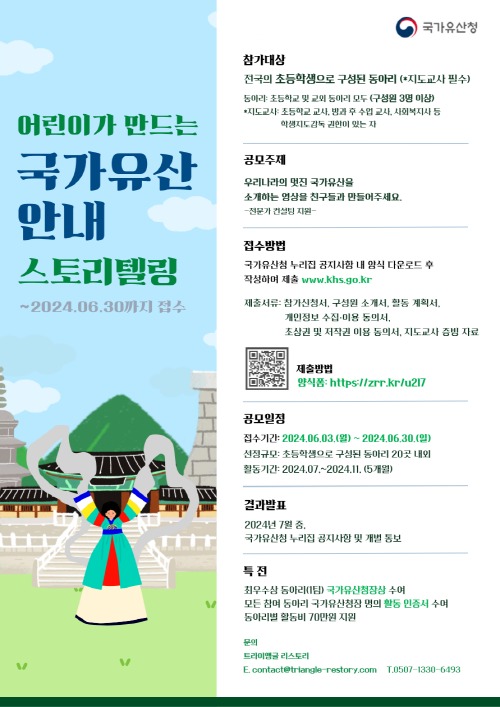 국가유산청은 국가유산 체계 전환에 발맞춰 오는 6월 30일(일)까지 우리 국가유산의 역사적 가치와 우수성을 담은 콘텐츠를 제작하는 「2024 어린이가 만드는 국가유산 안내 스토리텔링 공모전」에 참여할 어린이(초등학생 동아리)를 모집한다.