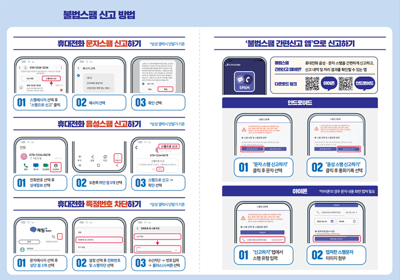 한편, 방통위는 악성 스팸 의심문자의 열람에 주의하고 신속하게 신고해 줄 것을 당부하면서 ▲출처가 불분명한 문자(SMS)의 인터넷주소(URL) 클릭이나 전화연결 금지 ▲불법 및 악성스팸 의심문자는 휴대전화 간편신고 기능 또는 간편신고 앱으로 신고 ▲피해가 의심되면 국번없이 118로 상담 또는 국번없이 112로 신고를 요청했다.
