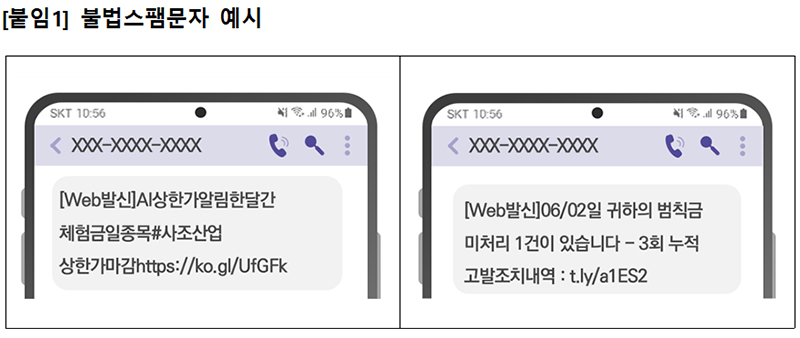 특히 주식투자, 도박, 스미싱 문자가 증가했으며 주요 발송경로는 대량문자 발송서비스인 것으로 파악됐다.