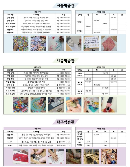 ▲ 서울학습관에서는 단청(문양·별화), 모사(화조화·초상화), 전통서각, 전통누비까지 6개 과정 ▲ 세종학습관에서는 단청(문양·별화), 전각(전통·디자인), 배첩(족자·장정), 모사(화조화·초상화)까지 8개 과정 ▲ 대구학습관에서는 전통전각, 전통자수, 소목(1·2)까지 4개 과정을 운영한다. 각 과정에는 국가무형유산 이수자, 국가유산수리기능인 등 분야별 전문가가 강사로 참여한다.