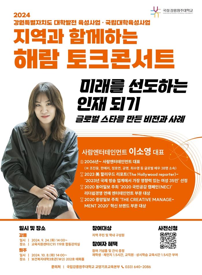 오늘(24일) 개최되는 ‘2024학년도 지역과 함께하는 해람토크콘서트’는 국립강릉원주대 교양기초교육본부의 2024년도 강원특별자치도 대학발전 육성사업·국립대학육성사업 일환으로 캠퍼스별로 진행되는 토크 콘서트. 매년 유명 인사를 초청하고 있는 가운데, 올해에는 사람엔터 이소영 대표가 ‘미래를 선도하는 인재되기: 글로벌 스타를 만든 비전과 사례’를 주제로 참석한다.