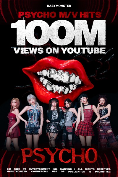 YG엔터테인먼트에 따르면 베이비몬스터의 미니 2집 [WE GO UP] 수록곡 'PSYCHO' 뮤직비디오는 이날 오전 11시 30분께 유튜브 1억 조회수를 넘어섰다. 지난 19일 공개된 지 약 14일 만으로, 올해 발매된 K팝 중 최단 기간 1억 뷰 돌파 기록을 쓴 타이틀곡 'WE GO UP'(약 13일)에 버금가는 매우 빠른 속도다.